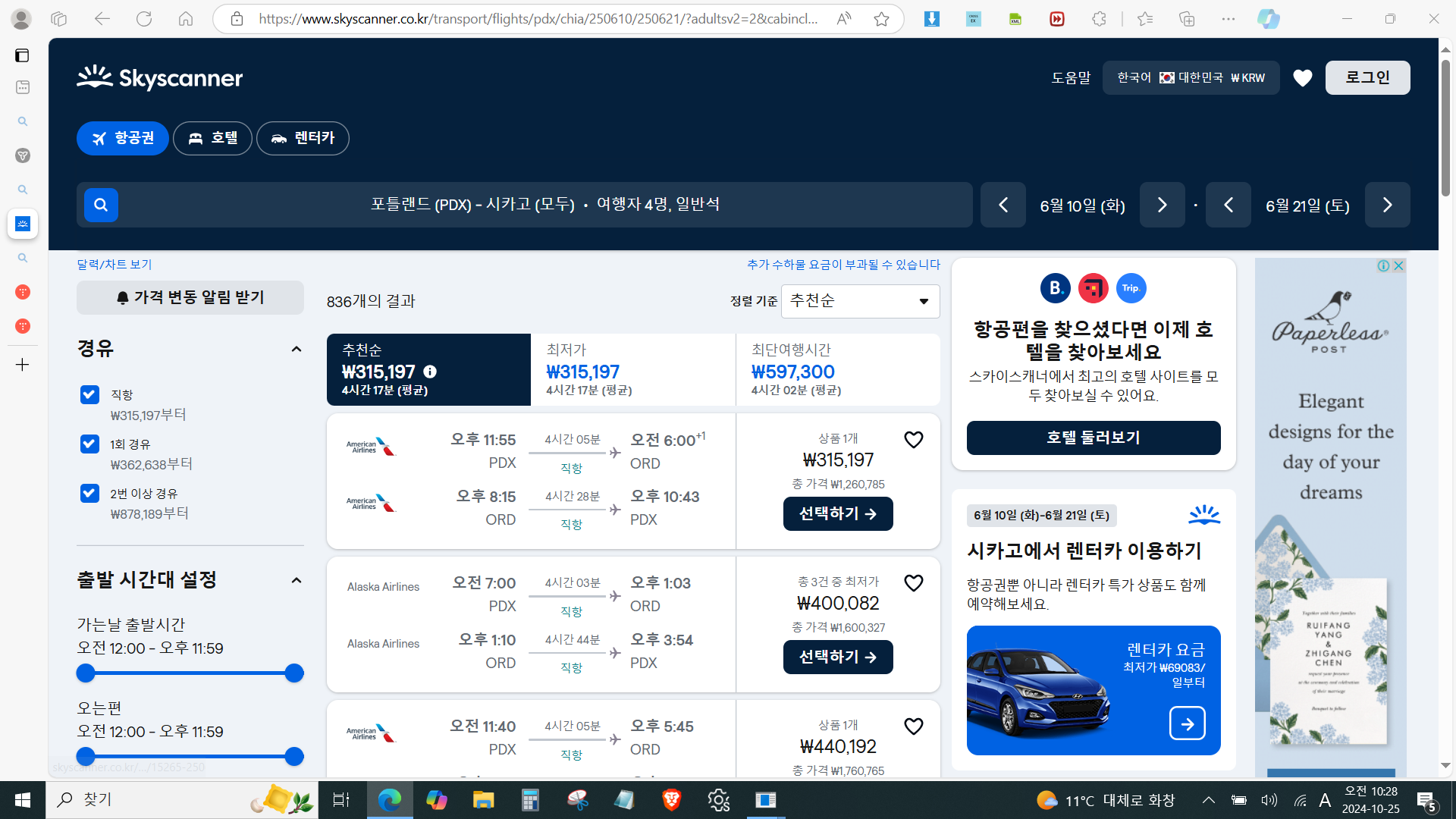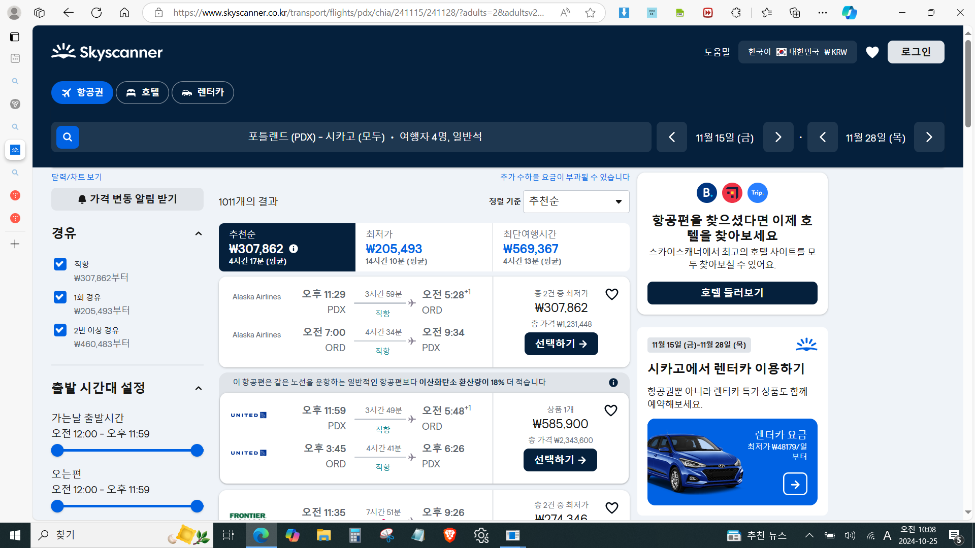 4. 시카고 4시간반 : 화밤 출발 약45만 180만 왕복